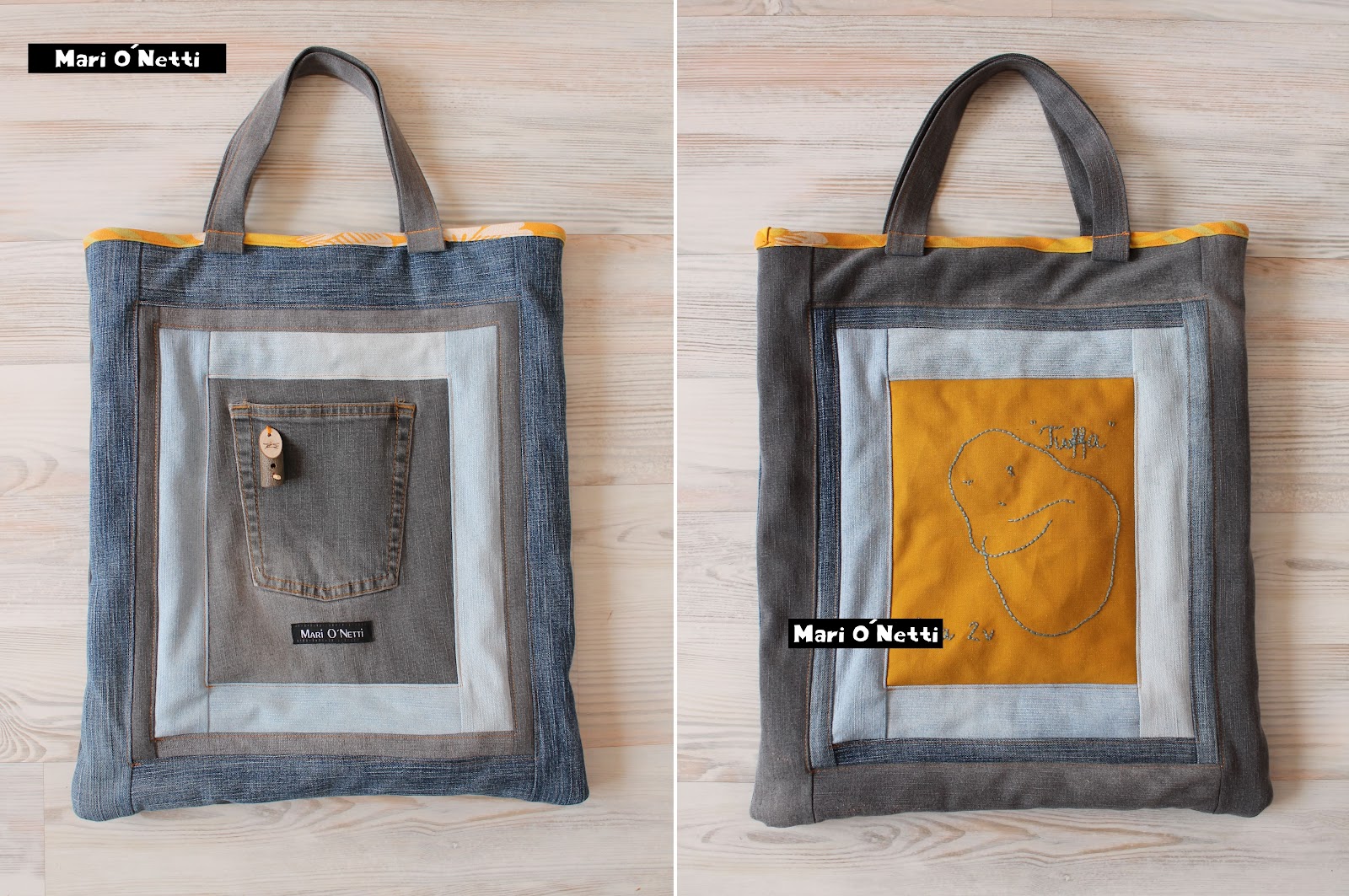 Mökkikassin tilkut leikkelin vanhoista farkuista ja jonkin tilkkukirjani innoittamana tein siihen oikein vanutikkauksen. Aika hassun tönkkö lopputulos, mutta onpahan ainakin jämäkkä. Pikkusiskon piirroksen jäljensin kirjomalla.